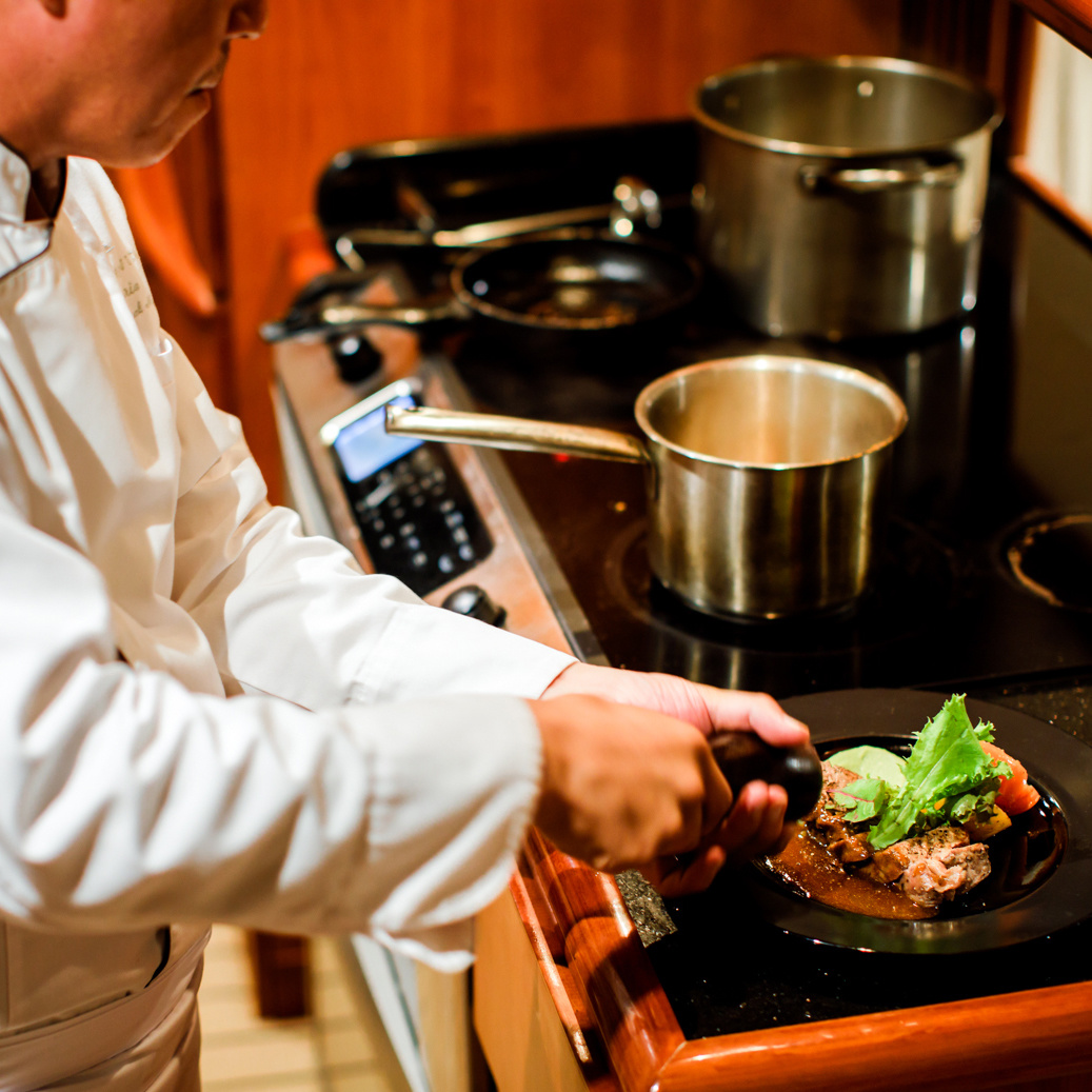 専属シェフが目の前で作り上げる特別なコースディナーで至福のひと時をお楽しみいただけます。