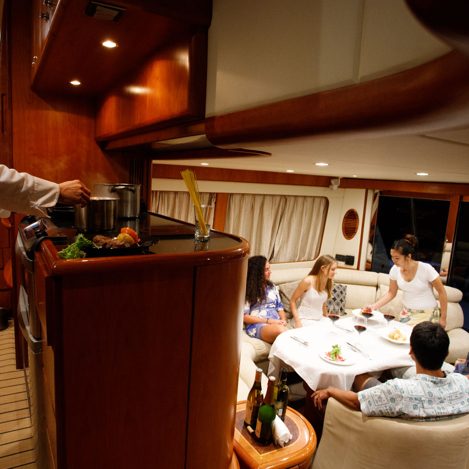 シャワールーム(2室)、船内キッチン、エアコン、音響システム